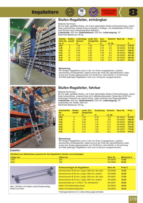Schienenanlagen für Regalleitern Best.-Nr. Preis 7