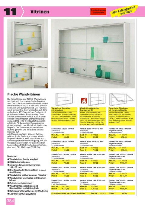 Vitrinen sind darüber hinaus auch in einer 140 x 15, Gehrungsecken, ESG- Baustoffklasse B1 (schwer Flügeltür, Aluminiumrahmen