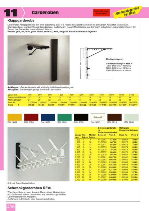 Farben der Garderobe, Hakenabstand 100 mm.