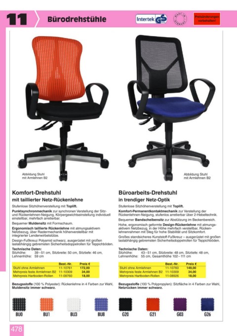 Bezugsstoffe (100 % Polyester): Rückenlehne in 4 Farben zur Wahl, Bezugsstoffe (100 % Polypropylen): Sitzfläche in 4 Farben zur Wahl,