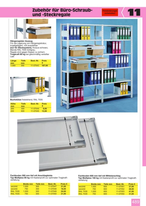 Fachboden 300 mm tief mit Anschlagleiste Fachboden 600 mm tief mit Mittelanschlag