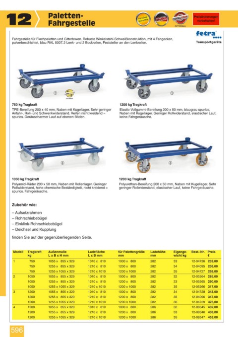 Fahrgestelle für Flachpaletten und Gitterboxen. Robuste Winkelstahl-Schweißkonstruktion, mit 4 Fangecken,
