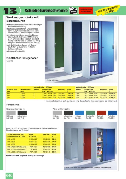 Zusatzfachböden verz. Maße Best.-Nr. Preis