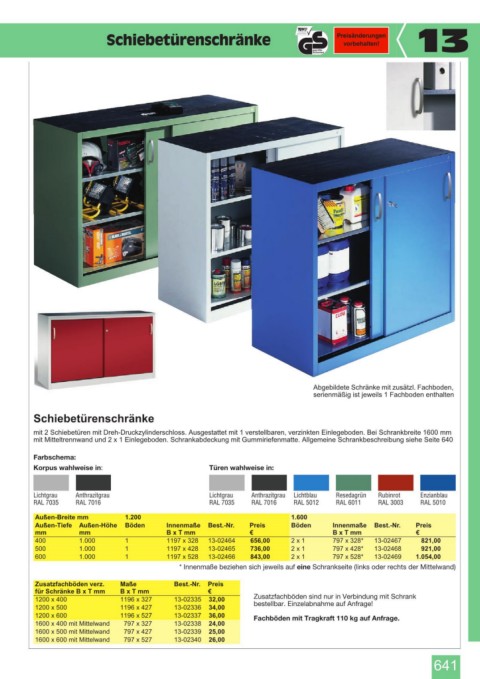 Zusatzfachböden verz. Maße Best.-Nr. Preis
