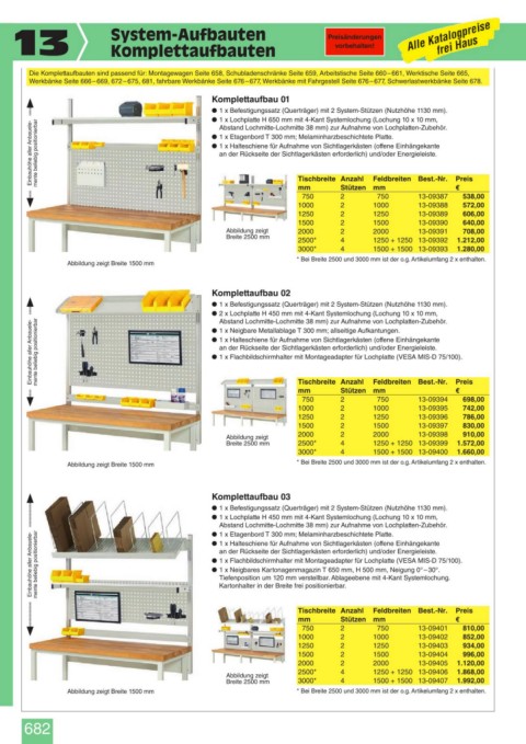 Werkbänke Seite 666 – 669, 672 – 675, 681, fahrbare Werkbänke Seite 676 – 677, Werkbänke mit Fahrgestell Seite 676 – 677, Schwerlastwerkbänke Seite 678.