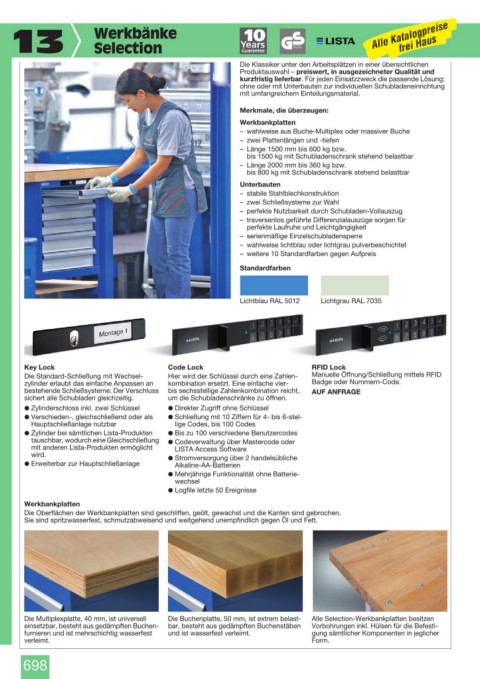 Die Multiplexplatte, 40 mm, ist universell Die Buchenplatte, 50 mm, ist extrem belast- Alle Selection-Werkbankplatten besitzen
