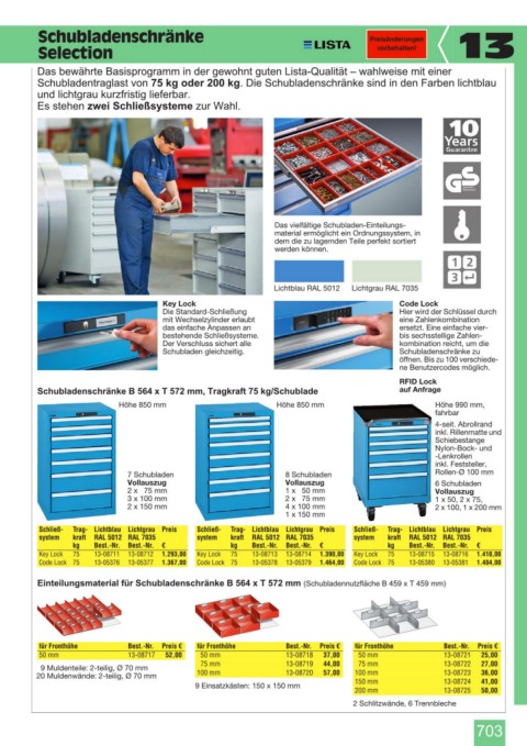 Schubladentraglast von 75 kg oder 200 kg. Die Schubladenschränke sind in den Farben lichtblau