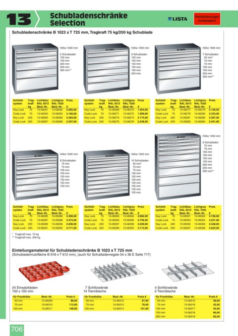 Schubladenschränke B 1023 x T 725 mm, Tragkraft 75 kg/200 kg Schublade