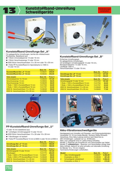 Kunststoffband-Set „A“ 16 mm 13-06242 252,00 Umreifungs-Set „B“ 13 mm 13-01762 237,00